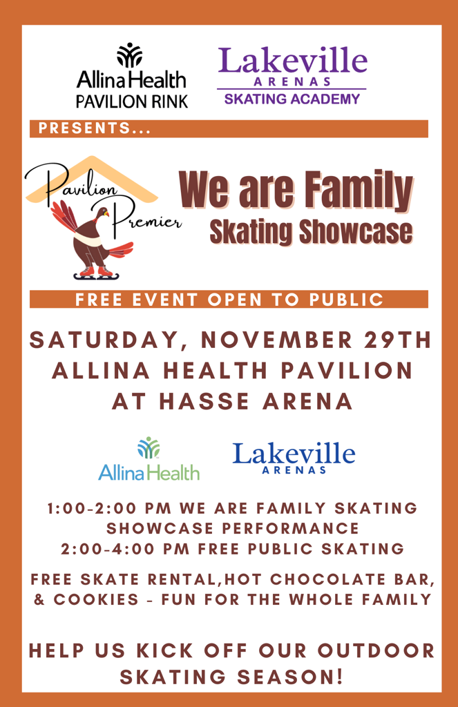 Lakeville Skating Academy is excited to present our second annual outdoor exhibition the Pavilion Premier, to kick off the season for outdoor skating. The theme for this performance is We Are Family.